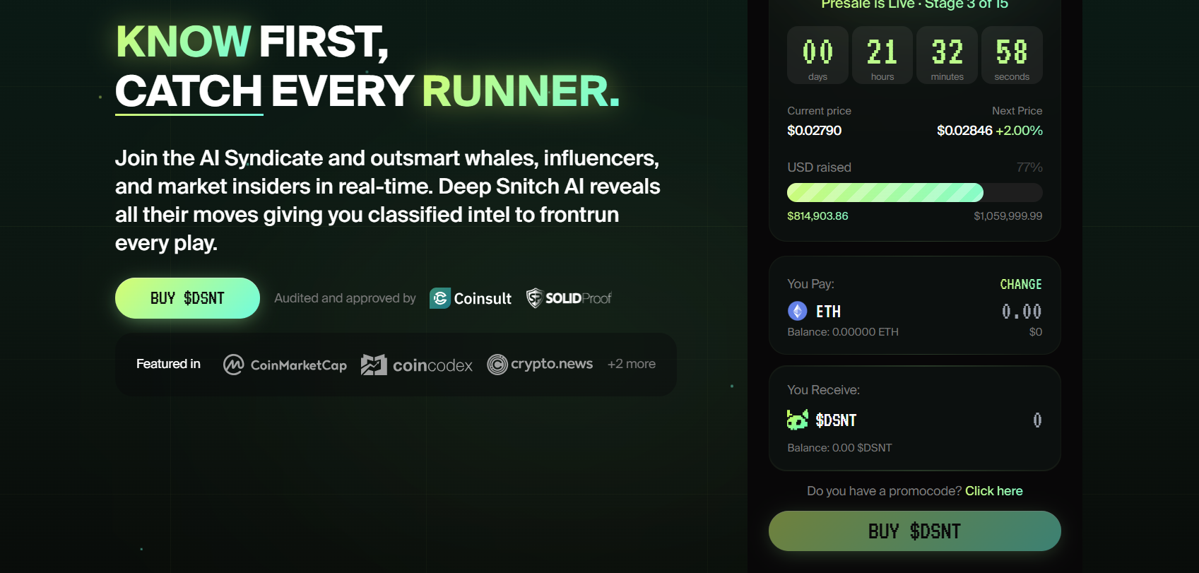 DeepSnitch AI is currently running a presale event. As part of the presale, 35% of the total $DSNT token supply will be sold to investors at a discount. Through the token sale, DeepSnitch AI plans to raise funds for project development and marketing.